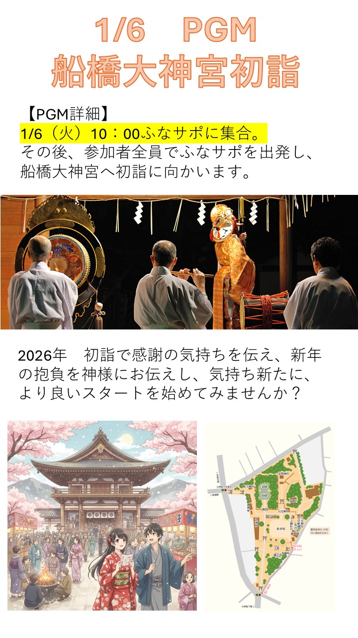 1月6日(火) 10:00ふなサポに集合後、初詣PGM(船橋大神宮初詣)を開催致します。 皆で神社参拝をして、2026年をスタートしてみませんか? 初詣