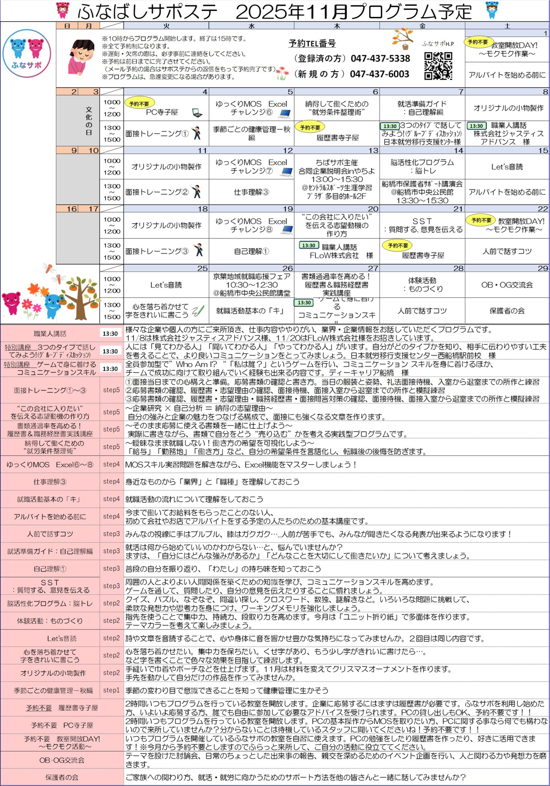 11月のプログラムが決まりました♪ 今月から各プログラムに指標を設けています。 自分がいまどの段階にいるのか「ふなサポ職業準備性ピラミッド」で確認して それに合ったプログラムに出るのも良し、基本に立ち返るも良し、まずは全 […]