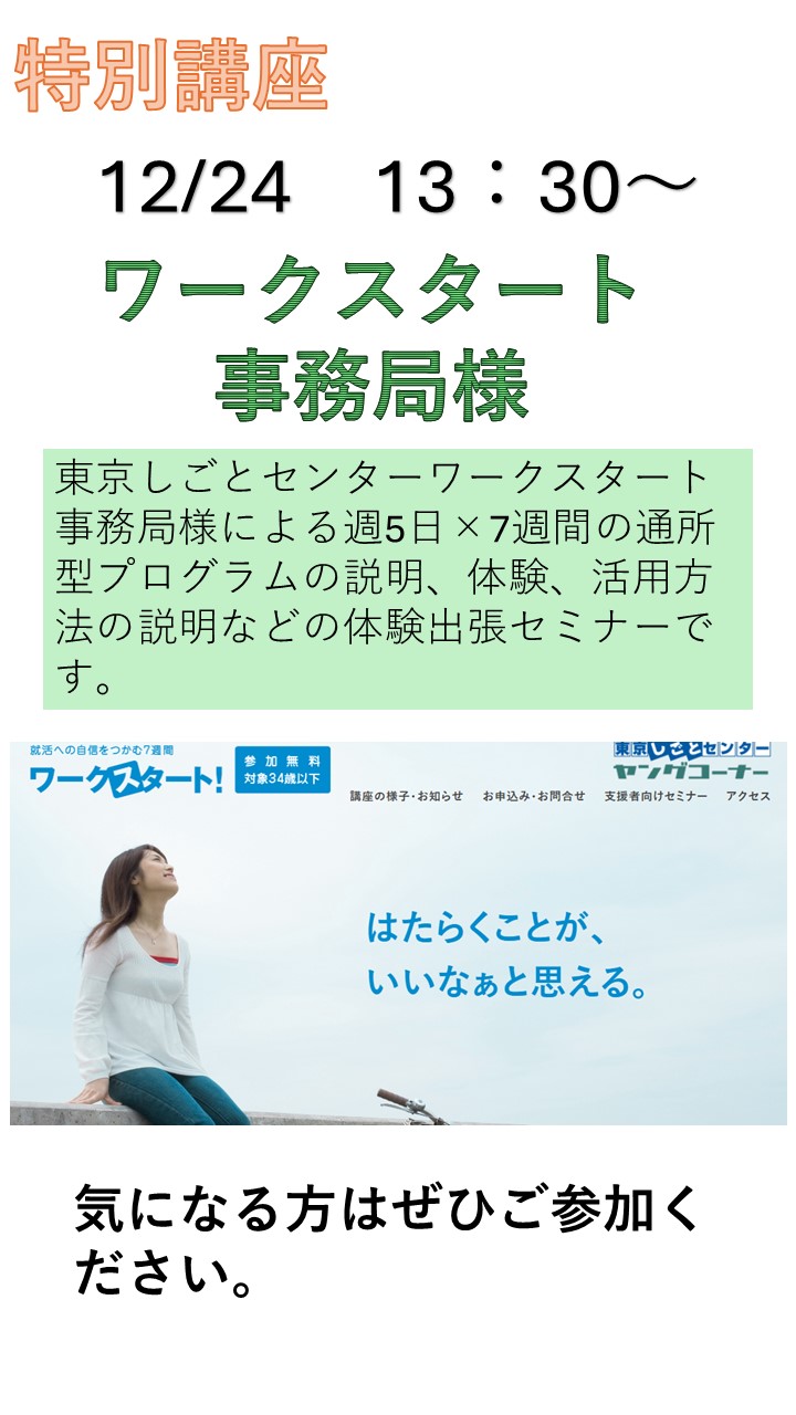 12/5(金)13:30~ 東京ミドルワークチャレンジ事務局様の特別講座が開催されます。 ※対象者は35歳以上の方となっています。 就活に向けて、頑張りたいが、正社員の経験がなく不安等、漠然とした不安を感じている方など、 […]