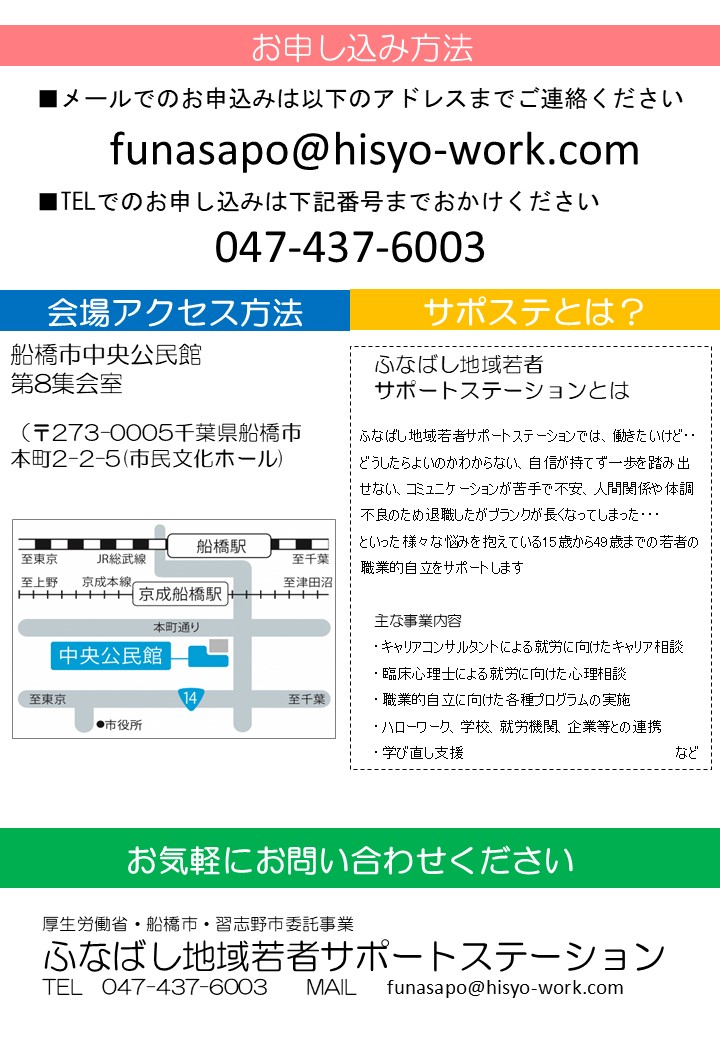 令和7年度ふなばしサポステ【ふなばし講演会】リーフレット – 裏面 イベント・プログラム新着記事 【ハローワーク船橋】11月26日(水)6所共催「京葉地域就職応援フェア」のお知らせ 11月のプログラムが決まりました! 11/7(金)特別講座と11/8(土)職業人講話のご案内 予約不要!「PC寺子屋」「履歴書寺子屋」始まります ブログ新着記事 【PGM】オリジナルの小物製作の作品紹介&プログラム参加のお誘い 若松団地夏祭りにふなサポ出店!! 9/5和菓子作り体験会が開催されました ふなサポが紹介されました! Posts by funa_sapo