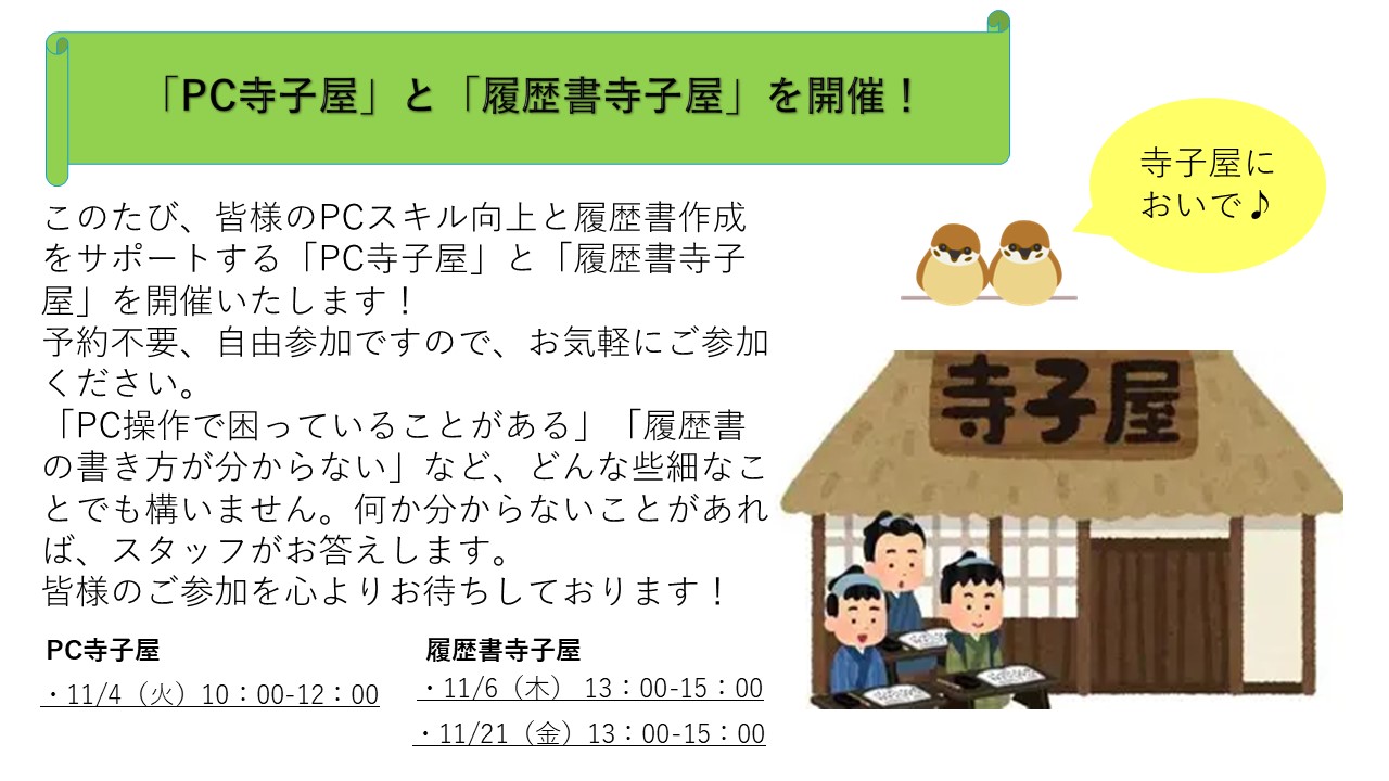 寺子屋 イベント・プログラム新着記事 【ハローワーク船橋】11月26日(水)6所共催「京葉地域就職応援フェア」のお知らせ 11月のプログラムが決まりました! 11/7(金)特別講座と11/8(土)職業人講話のご案内 予約不要!「PC寺子屋」「履歴書寺子屋」始まります ブログ新着記事 【PGM】オリジナルの小物製作の作品紹介&プログラム参加のお誘い 若松団地夏祭りにふなサポ出店!! 9/5和菓子作り体験会が開催されました ふなサポが紹介されました! Posts by funa_sapo