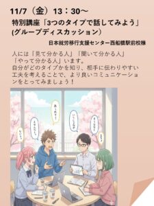 11/7(金)特別講座と11/8(土)職業人講話のご案内 利用者の方もこれから利用を考えている方もぜひご参加ください。 その際は予約が必要になります、ご連絡お待ちしています。 11月特別講座 予約不要!「PC寺子屋」「履歴書寺子屋」始まります 11月のプログラムが決まりました! イベント・プログラム新着記事 【ハローワーク船橋】11月26日(水)6所共催「京葉地域就職応援フェア」のお知らせ 11月のプログラムが決まりました! 11/7(金)特別講座と11/8(土)職業人講話のご案内 予約不要!「PC寺子屋」「履歴書寺子屋」始まります ブログ新着記事 【PGM】オリジナルの小物製作の作品紹介&プログラム参加のお誘い 若松団地夏祭りにふなサポ出店!! 9/5和菓子作り体験会が開催されました ふなサポが紹介されました! Posts by funa_sapo