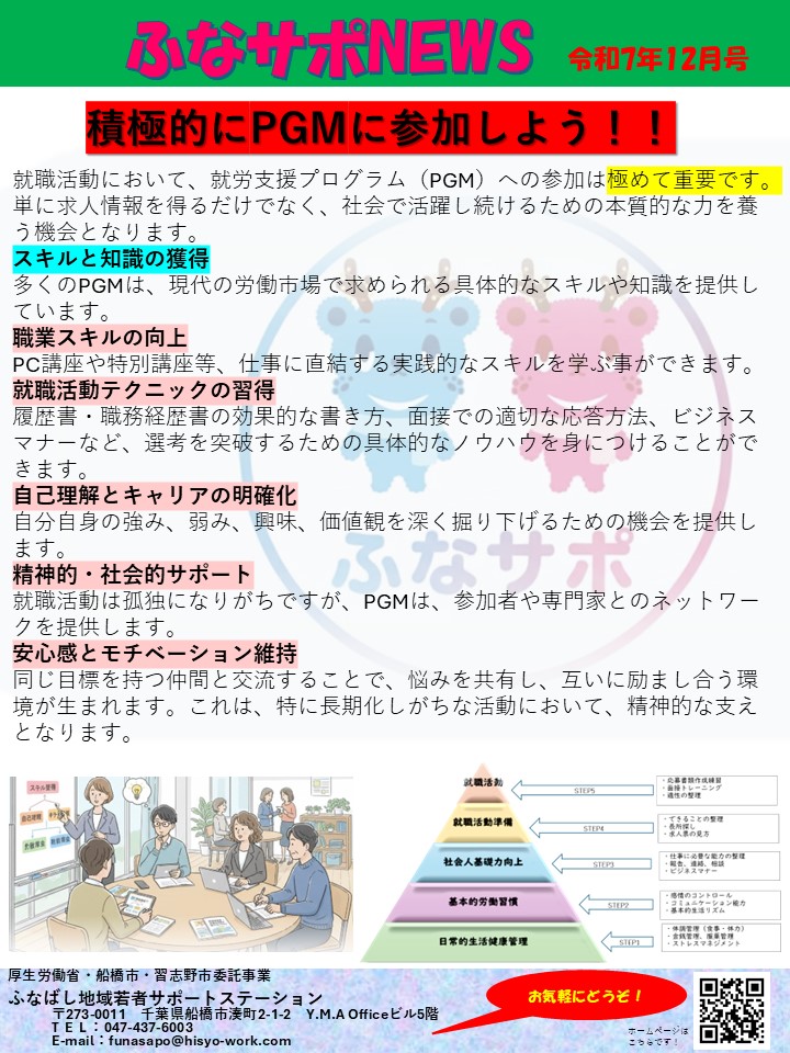 ふなサポNEWS2025年12月号 イベント・プログラム新着記事 12/12(金)特別講座開催のお知らせ 12/11(木)職業人講話開催のお知らせ 12/5(金)特別講座のお知らせ 11/27(木)特別講座開催のお知らせ ブログ新着記事 【PGM】オリジナルの小物製作の作品紹介&プログラム参加のお誘い 若松団地夏祭りにふなサポ出店!! 9/5和菓子作り体験会が開催されました ふなサポが紹介されました! Posts by funa_sapo