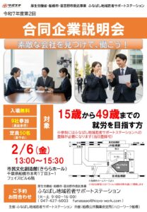 令和7年度第2回ふなサポ主催合同企業説明会 イベント・プログラム新着記事 【お知らせ】2月14日船橋大神宮朝市ボランティア参加者募集 【冬期休所のお知らせ❄️】 1/6初詣PGM今年も開催いたします! 【お知らせ】第2回ふなサポ合同企業説明会が2/6(金)開催されます! ブログ新着記事 【活動報告】仲間と共に、新たな一歩を。船橋大神宮へ初詣に行ってきました! JR千葉鉄道様清掃体験レポ 【PGM紹介】人前で話すコツ 【活動報告】ゲームで身に着けるコミュニケーションスキル Posts by funa_sapo