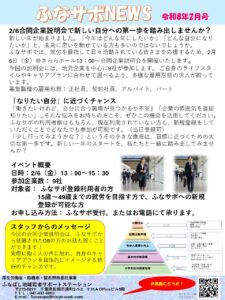 ふなサポNEWS2026年2月号 イベント・プログラム新着記事 2月のプログラム決定👹 【お知らせ】2月14日船橋大神宮朝市ボランティア参加者募集 【冬期休所のお知らせ❄️】 1/6初詣PGM今年も開催いたします! ブログ新着記事 【活動報告】仲間と共に、新たな一歩を。船橋大神宮へ初詣に行ってきました! JR千葉鉄道様清掃体験レポ 【PGM紹介】人前で話すコツ 【活動報告】ゲームで身に着けるコミュニケーションスキル Posts by funa_sapo